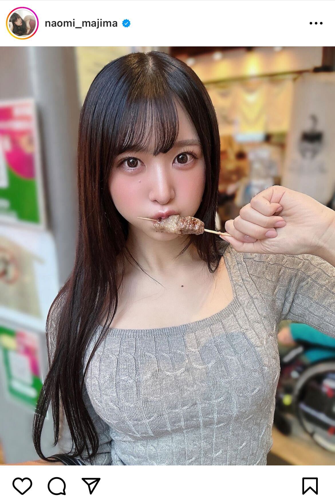 「はむっ」というコメントとともに、串焼き肉を頬張るオフショットを公開した。