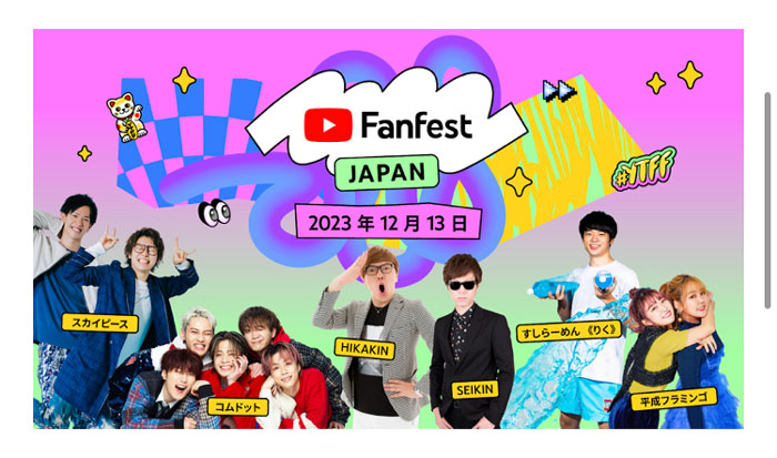 YouTubeは、今年で10回目の開催となるYouTube Fanfest Japan 2023(ユーチューブ ファンフェス)を12月13日(水)18時30分より、幕張イベントホールにて開催。本イベントはYouTube Fanfest公式チャンネルにてライブ配信も行う予 ...