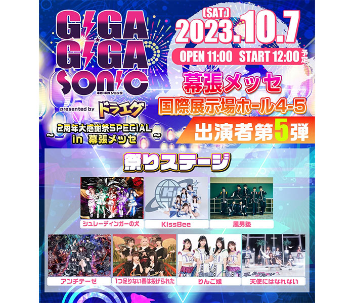 ギガソニ第5弾出演者に、シュレーディンガーの犬、風男塾、KissBee、りんご娘など出演決定!<GIGA・GIGA SONIC 2周年大感謝祭SPECIAL in 幕張メッセ presented by ドラゴンエッグ>