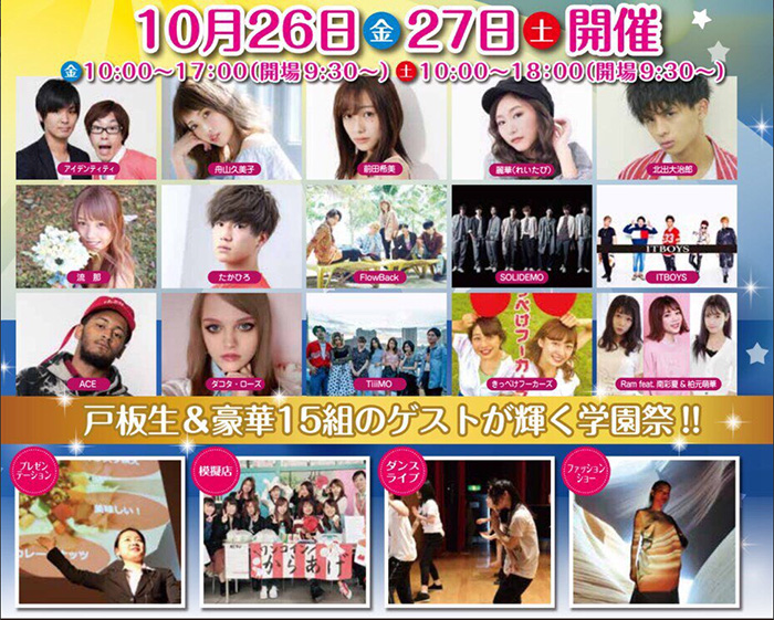戸板女子短期大学は、お笑い芸人、ミュージシャン、タレント、モデルなど15組が出演する、学園祭「TOITA Fes 2018 」を10/26(金)10/27(土)に開催する。東京・三田にある戸板女子短期大学は、10/26(金)~27(土)学園祭「TOITA Fes 201 ...