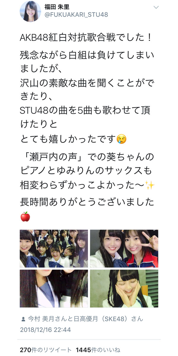 瀬戸内7県を拠点に活躍するアイドルグループ・STU48の福田朱里が12月16日(日)、自身のツイッターを更新した。