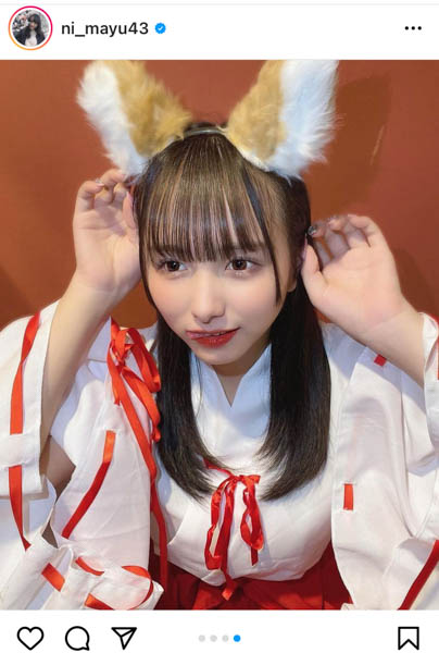 新谷は投稿で「きつねうどん一緒に食べよ」とコメントを寄せるとともに、狐耳付きのカチューシャを付けた巫女コスプレを披露した。上目遣いで見つめる眼差しの可愛さに、あぶらあげをお供えしたくなるショットだ。