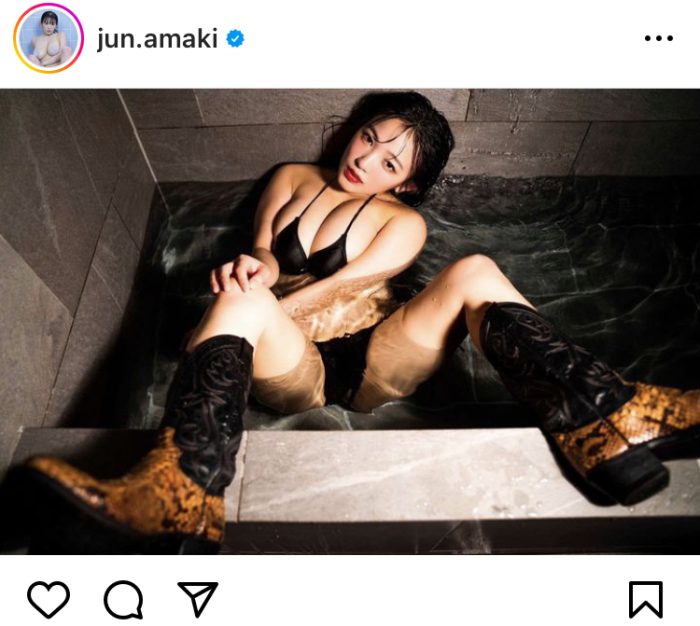 4月20日、グラビアアイドルの天木じゅんが自身のInstagramを更新した。天木は投稿で「5/4 15:00〜17:00 ラフォーレ原宿に来店イベントいきます!!」とイベント告知を寄せるとともに、風呂に浸かってM字開脚をした濡れ肌セクシーショットを公開した。[Ad2] ...