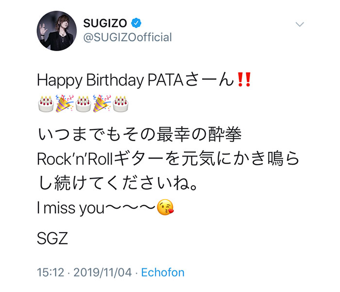 SUGIZOがX JAPAN PATAの誕生日を祝福!「PATAさん、最幸の酔拳~」「メンバー愛にウルウルします」とファンも祝福
