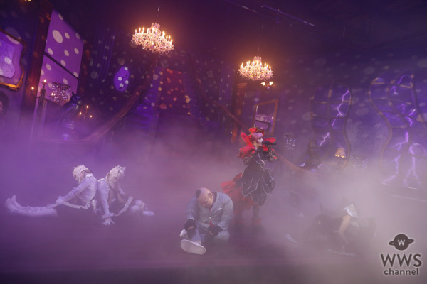 ライブのスタートと共に画面に現れたのは恐ろしげな容貌の“執事”を名乗る男。森の奥にひっそりたたずむ洋館。そこには、とある“ファミリー”が人間から身を隠すように暮らしており、その洋館に迷い込んでしまった観客が、彼ら“ファミリー”にバレないよう、モンスターに扮して、一夜限りの復活を遂げる“ファミリー”の長女を迎える宴に参加するというストーリーが明かされると、双子のツインズ、父、母、黒猫を従えた、長女・きゃりーぱみゅぱみゅが登場。ダークなスモーキーメイクにクロスモチーフの黒いドレスに身を包み、洋館の大広間をステージに見立て「ファッションモンスター」「きらきらキラー」などを披露した。