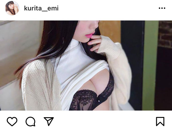 くりえみは投稿で「タートルニットの下に着てるエッチな下着……っていうシチュエーションが好きです」とコメント。写真では白のタートルネックをまくりあげ、黒の大人ランジェリーを見せつけた。