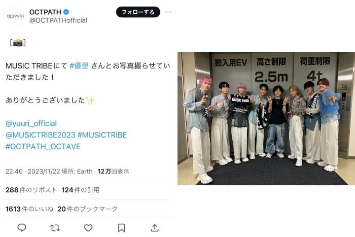 11月22日、ダンスボーカルグループ・OCTPATHの公式Xが更新された。OCTPATH公式アカウントは、メンバーとシンガーソングライター・優里の集合写真を掲載。「MUSIC TRIBEにて #優里 さんとお写真撮らせていただきました!ありがとうございました」とポストし ...
