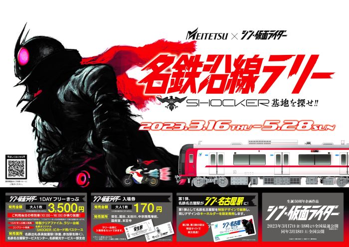 名古屋鉄道は映画『シン・仮面ライダー』とコラボし、3月16日から5月28日まで「名鉄沿線ラリー SHOCKER基地を探せ!!」を実施する。本企画は、ラリー専用きっぷを購入の上、駅名に『SHOCKER』の文字が隠された6駅を巡り、各駅でシールを集めていくもの。6駅分全ての ...
